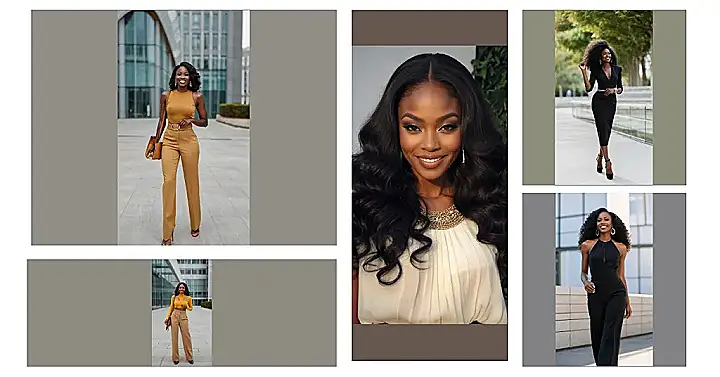 This image is all kinds of fabulous! Just look at this stunning black jumpsuit— it’s like the ultimate “black lady outfits” goal. It’s sleek, chic, and makes this model look like she’s ready to take on the world (or at least, a seriously awesome party). The cut is super flattering, and that hair? Don’t even get me started! The whole look screams confidence and style—who needs a tiara when you’ve got that much swagger?