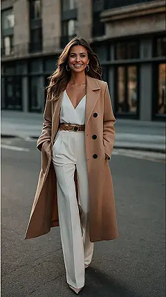 Hey there, fashion-forward friend! Picture this: it’s fall, the leaves are turning gorgeous shades of orange and red, and you’re heading to a brunch so fabulous, it deserves an outfit that’s just as amazing. This picture shows exactly what I mean! That creamy white jumpsuit is like a blank canvas waiting for a stylish masterpiece. And that camel-colored coat? Total boss vibes. It’s like, “I’m stylish, I’m warm, and I’m ready for pancakes.” Seriously though, this outfit screams effortless cool – perfect for impressing your friends (and maybe snagging that last mimosa).