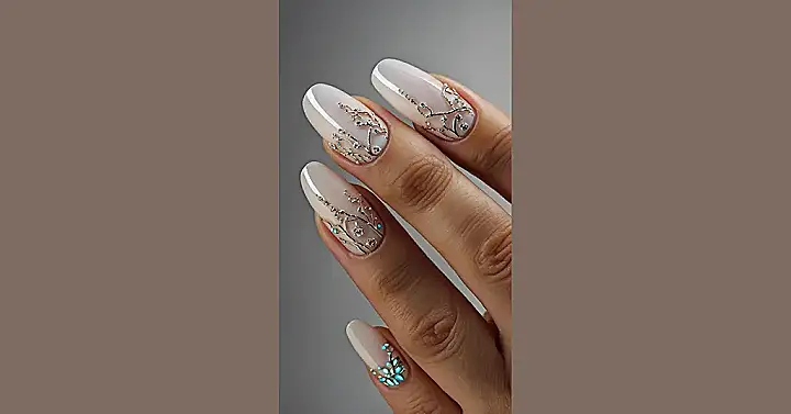 Thinking you need nails that look fancy but aren’t, like, screaming for attention? These are basically the nail version of smart casual – sophisticated but chill. They’ve got this lovely simple base color, then BAM, tiny sparkly branches appear! It’s like your fingers decided to wear elegant little crowns made of glitter and silver, maybe even some cool blue ones. Totally classy, absolutely not basic, and definitely makes your hands feel way more important than they probably are.