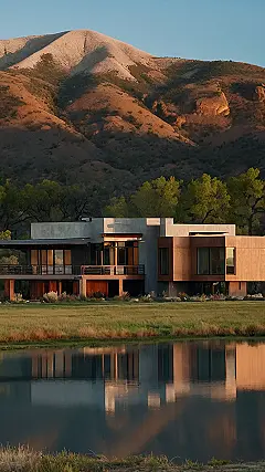 This house is seriously cool! It’s like someone took a regular ranch house and gave it a makeover with sleek lines, modern materials, and lots of glass windows. The house sits right in front of a pond, which is pretty amazing, but the real showstopper is the HUGE mountain behind it. It’s like the house is saying, “Hey, check out my awesome view!” It’s the perfect place to hang out with friends, maybe have a bonfire by the pond, and just enjoy the awesome scenery.