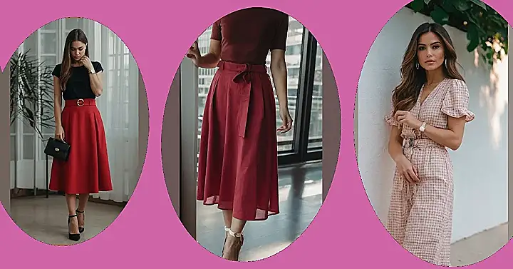 This outfit is like a delicious red velvet cake: sweet, stylish, and a little bit fancy! It’s perfect for a day out with friends, a casual coffee date, or even a fancy dinner. The flowy skirt is super comfortable and looks amazing, and that bold belt adds a touch of “I’m totally in charge” attitude. And let’s not forget those killer heels! They’re like the cherry on top of the cake, making this whole look extra fabulous.