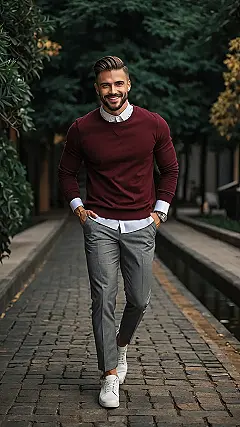 Putting together a “men’s business outfit” doesn’t mean you have to dress like you’re heading to a penguin convention. Look at this guy! He’s rocking a sharp shirt and a sweater that probably feels like wearing a hug, proving you can look like you mean business without feeling stiff. It’s like the outfit is saying, “I’m serious about success, but I’m also chill enough to remember how to smile.” Forget the boring uniform; this is how you blend professionalism with actual comfort.