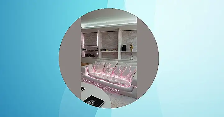 This living room is straight out of a magazine! It’s got a super comfy-looking couch, and it’s got all the right vibes for a relaxing night in. The pink lights make the couch look like it’s glowing, like a spaceship about to take off on a cosmic adventure. Imagine sinking into those plush cushions and losing yourself in a good book or a movie marathon – you wouldn’t want to leave!
