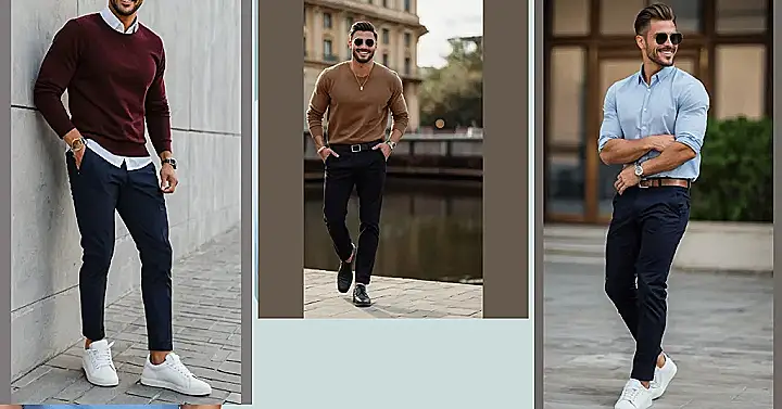 This guy’s got the whole “smart casual” thing down pat, which means he’s ready for anything! He’s rocking a black sweater, a crisp white shirt (peeking out just enough, see?), and some trendy, brown pants. His white sneakers say he’s comfy and ready to hit the streets, but the fancy watch on his wrist shows he’s got style for days! It’s like he’s saying “I’m ready for a meeting, a coffee date, or to run errands in style, bring it on!”