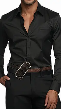 This outfit is so sleek, it could cut glass! We’re talking seriously high-end men’s fashion here – a killer black shirt so smooth it looks like it was made of liquid midnight, paired with perfectly tailored black pants. It’s the kind of look that whispers, “I’m effortlessly cool, and I know it.” Even the belt buckle looks like it belongs in a James Bond movie – talk about adding some serious swagger! Forget superheroes, this guy’s a super-stylish secret agent.