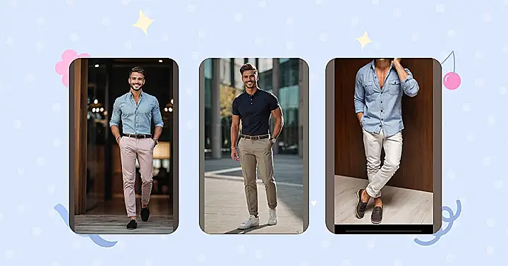 Want to look effortlessly stylish without even trying? This light blue shirt and white pants combo is like the “cheat code” for casual wear. It’s comfy enough to chill with your friends but still sharp enough to impress your crush. Plus, you could totally rock this outfit to a family gathering and your aunt would definitely say you look handsome!