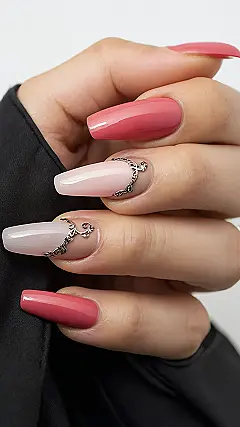 So, you want your nails to scream “spring,” huh? Well, ditch the dark and stormy vibes and embrace these shades! The nails in the picture are rocking some serious springtime feels with those soft pinks and coral hues. It’s like a garden party for your fingertips. Plus, the fancy metal accents add a little extra pizzazz, so you’ll be turning heads wherever you go. Watch out, flowers, there’s a new bloom in town!