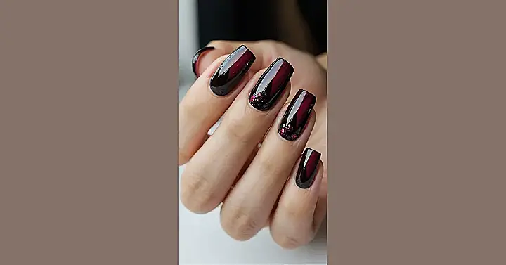 This manicure is giving us major “winter wonderland” vibes! Imagine a snowy night, twinkling with lights, and a beautiful, dark sky above. That’s what this deep, burgundy nail polish reminds us of, and the sparkly little jewels are like the tiny lights that make the whole thing pop! It’s almost like a glamorous, grown-up version of those festive, glittery snowflakes you used to make in elementary school.