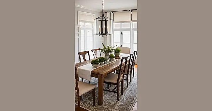 Imagine your dining room as a blank canvas, just waiting for its glow-up! This picture shows how you can totally transform your space into something special. Notice the little details, like the plants and that cool light fixture, that take it to the next level. You can get creative and add your own personal touch too!