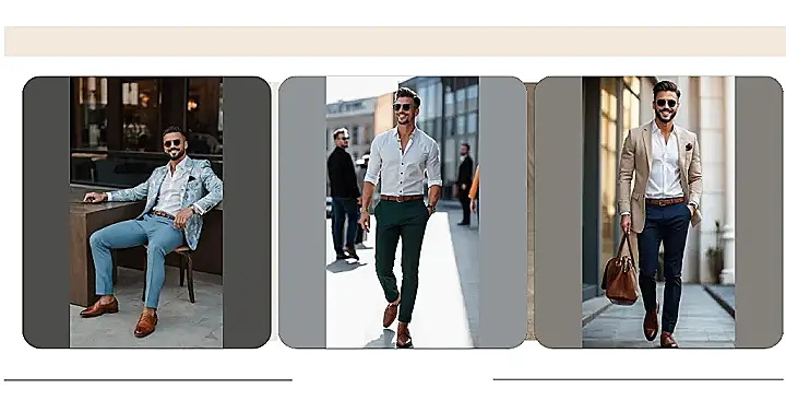 Peeking closer at this well-dressed man outfit, it’s not even complicated stuff! We’re talking a clean white shirt that fits right, some cool colored pants that aren’t your usual denim (whoa, revolutionary!), and a belt that somehow magically matches his shoes – maybe that’s the secret handshake of style? Throw on some sunglasses to look mysterious and a watch so you know exactly how much time you wasted picking out your outfit, and you’re basically ready for anything. Getting your look together doesn’t have to be harder than finding matching socks; it’s really just about picking pieces that look good and make you feel like the coolest version of yourself.