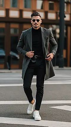 Check out this guy strolling down the street looking like he just stepped out of a movie about really important people. That grey coat and black turtleneck combo? It’s like he’s saying, “Yeah, I’m looking sharp, what about it?” And then he throws on some fresh white sneakers, because who needs uncomfortable dress shoes when you’re conquering the world one block at a time? It’s a perfect example of how mixing fancy and chill can make you look seriously put-together without trying too hard, or maybe trying just the right amount.