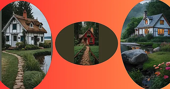The first cottage looks like it’s straight out of a fairytale! It’s got a charming stone chimney and a roof that looks like it’s made of shingles from a thousand different trees. It’s surrounded by a lush green lawn, perfect for playing hide-and-seek or just relaxing under the warm summer sun. This cottage feels like a place where dreams come true, filled with cozy fireplaces and stories whispered in the moonlight.