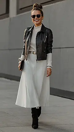 Hey there, fashion fans! Picture this: it’s a crisp autumn day, the leaves are turning glorious shades of orange and red, and you’re headed to a brunch so fabulous, it deserves an outfit to match. This look totally nails it! That white midi skirt is like a blank canvas – super stylish and ready for anything. The black leather jacket adds some serious edge, like you’re a secret agent on a mission to enjoy delicious pancakes. And those boots? Perfection. They’re like the finishing touch on a masterpiece, ready to stroll through those fall leaves while you Instagram your avocado toast.