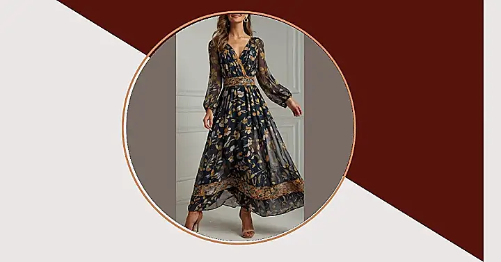 This dress is like a cozy autumn day, but in a gorgeous, flowing maxi dress. It’s got those fall vibes with the dark colors and floral patterns, making you feel like you’re walking through a forest full of leaves. And the long sleeves? Perfect for those chilly fall nights when you want to stay warm and stylish!
