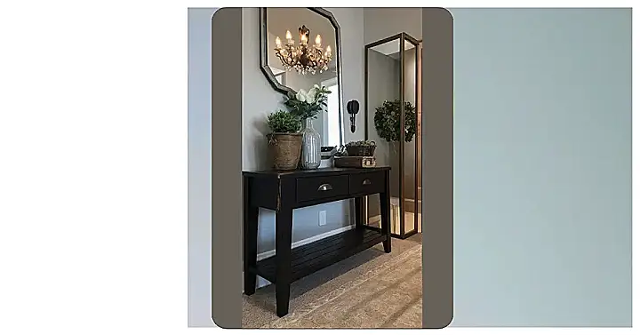 This isn’t your grandma’s entryway! Check out this seriously stylish console table – it’s like the star of a home decor show. With its dark, mysterious finish and handy drawers, it’s ready to hold all your stuff (keys, mail, that questionable rock collection you’ve been secretly hoarding). The pretty plants and mirror add a touch of elegance, proving that even a hallway can be a work of art. It’s the perfect mix of practical and pretty, which is basically the holy grail of home decor.