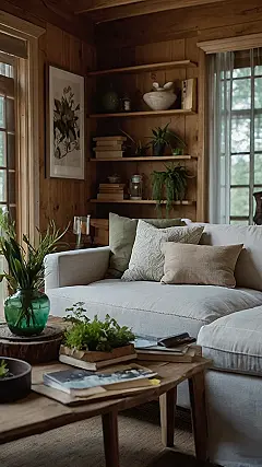 This room screams “chill vibes only,” like a comfy hug from Mother Nature herself. The wooden walls and shelves make you feel like you’re surrounded by a forest, and all those plants are like tiny green friends saying hello. Imagine snuggling up on that comfy couch with a good book and maybe a cup of hot cocoa. It’s the perfect spot to escape the hustle and bustle of everyday life and just relax for a while.