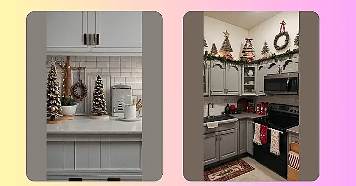 It’s amazing how a few simple decorations can completely transform a kitchen. From the garland draped around the top of the cabinets to those cheerful little stockings hanging on the oven, everything works together to create a magical atmosphere. It’s proof that you don’t need a mountain of tinsel to feel the Christmas spirit. You just need a little bit of imagination and a whole lot of holiday cheer!