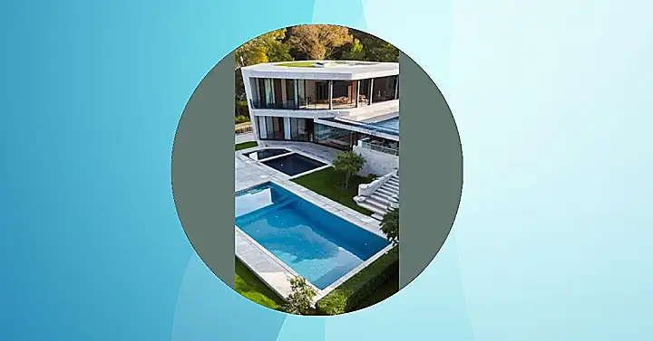 This image is a picture-perfect example of a mansion house with all the bells and whistles! The sparkling pool looks inviting, like it’s whispering, “Come take a dip, it’s my treat!” The house is super fancy, with columns like a Greek temple and big windows that let in all the sunshine. It looks like the perfect place to relax and maybe even throw a party.