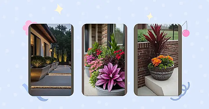 And the best part? You can totally get this fancy look without becoming a master gardener overnight. These tall, glowing plants in their awesome pots in the image? They make the whole entrance look like a movie scene, especially with those cool lights underneath. Planters let you add greenery and style without digging up your entire yard, turning your porch into the neighborhood’s new favorite spot, or at least the spot your mail carrier is secretly jealous of.