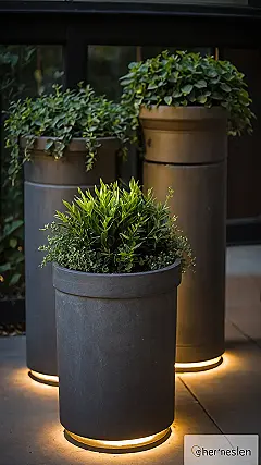 Look at these cool guys! These aren’t just regular flower pots; they’re like the VIPs of the plant world, chilling on your porch with their own personal spotlights. Imagine your house looking all fancy and welcoming, especially when the sun goes down and these sleek planters start glowing from the bottom. It’s like they’re saying, “Hey, come on in, we’ve got plants *and* mood lighting!” Putting these modern planters on your front porch isn’t just decorating; it’s basically giving your home a tiny, stylish concert stage for greenery, making your house look extra awesome right from the sidewalk.