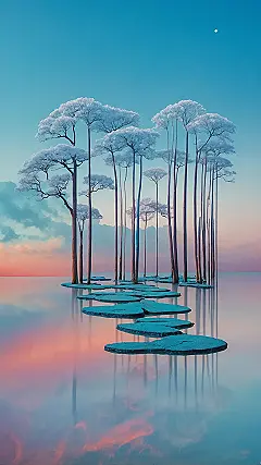 Check out this ridiculously peaceful scene! Those trees look like they’re wearing fluffy cloud hats and standing on stepping stones the size of dinner plates floating on water that looks like melted sherbet during a magical sunset. It’s the kind of view that makes your brain do a little happy dance and forget about that pile of homework for a hot second. If you’re feeling frazzled from, well, everything, this picture is basically a visual sigh of relief. It just screams ‘zen’, telling you to slow down and maybe admire some fancy trees instead of stressing.