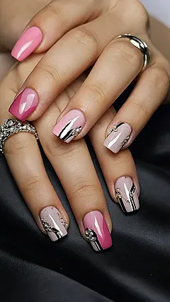 These nails are rocking a sweet and sassy look! It’s like they took all the best parts of a cute outfit—maybe a pink dress with a black ribbon—and shrunk it down to fit on your fingertips. You can almost imagine them going to a fancy tea party, sipping tiny cups of Earl Grey, and gossiping about which celebrity has the best eyebrows.