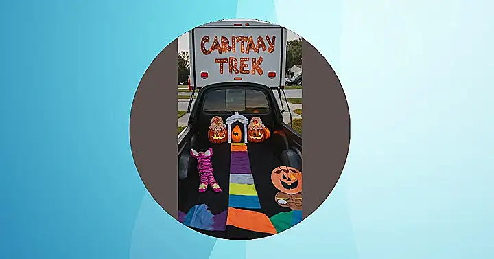 This truck bed is ready for some serious trick-or-treating fun! It looks like they’ve transformed their truck into a spooky wonderland, with colorful decorations, pumpkins galore, and a mysterious little creature in the pink striped pajamas. It’s like the truck bed is straight out of a Halloween movie! They’ve even got a little white archway, which looks like a portal to some spooky shenanigans. The kids will be so excited to check out all the decorations and grab some treats from this awesome truck!