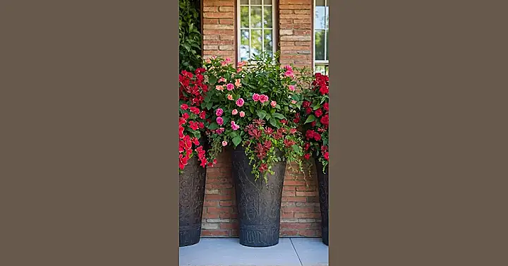 Look at these flowers! They’re basically having a block party right there on the front porch, showing off all their colourful petals in those fancy, tall planters. The pink roses are probably high-fiving the red ones, feeling like total rockstars basking in the sun. Putting big, cool planters like these by your door is like giving your house a superhero cape, instantly making it look way more inviting and less like it’s just standing there doing nothing. It’s like saying, “Hey world, check out my awesome floral vibe!”