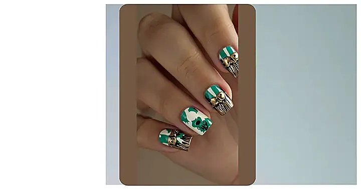 These nails are giving us major Scarecrow vibes! Just imagine, instead of scaring away birds in a field, they’re scaring away boring nail art! The green and white stripes, with the gold accents, look just like a scarecrow’s outfit. And those little golden “faces” on each nail? They’re like the scarecrow’s button eyes, staring out at the world with a mischievous grin.