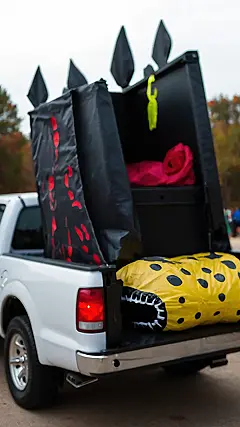 This truck is ready to party! It’s decked out with spooky pumpkins and colorful decorations, just like your favorite haunted house. Imagine all the fun you could have decorating your own truck bed for Trunk or Treat! You could make a spooky spiderweb with fake cobwebs, or maybe put up some glow-in-the-dark skeletons! The possibilities are endless, and you can get really creative with your truck bed decor to impress everyone at the neighborhood Trunk or Treat!
