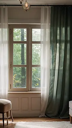 The image shows a window with two sets of curtains. The sheer white curtains are flowing gently, like a princess’s gown, while the darker green ones are pulled tightly, hiding a secret! What’s behind those green curtains? Maybe it’s a magical portal to a hidden world, or a treasure chest filled with gold! Or maybe it’s just a boring closet. You decide!