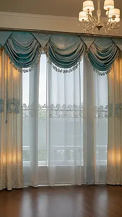 These curtains are like the fancy dress of the window world. They’re so swirly and frilly, they look like they could be part of a royal palace! The light peeks through them like a secret, and they have all these fancy details like lace and tassels. They’re like the most fashionable window coverings you’ve ever seen, maybe even the most stylish in the whole neighborhood!