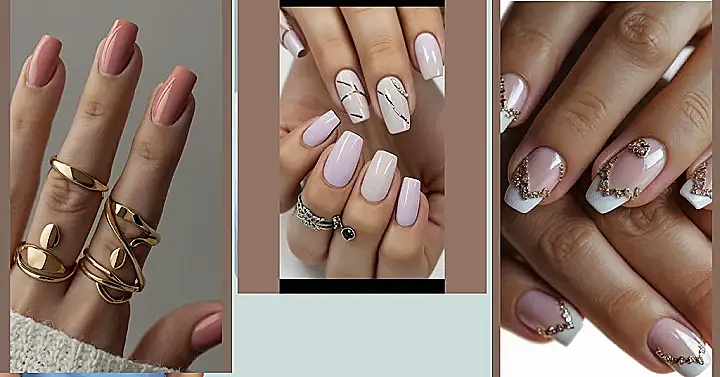 **Paragraph 1:** OMG, check out these nails! They’re totally trendy and minimalist – like, the epitome of chic without being too much. Imagine: soft, pretty pastel colours (think lilac and creamy beige) on perfectly shaped nails. Some have these delicate gold lines, like tiny works of art, and a few are even sprinkled with sparkly rhinestones. It’s like someone took a sigh of elegance and painted it onto fingertips! It’s the perfect balance of simple and sophisticated, not too flashy, not too boring – just right.