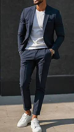 This look is all about mixing fancy with fun. Imagine ditching the tie but keeping the confidence of someone who *could* wear a tie and own the whole room. Pairing a suit with sneakers is like telling the world you’re stylish, but you also value your feet. Plus, you can actually run for the bus if you need to. What’s not to love?