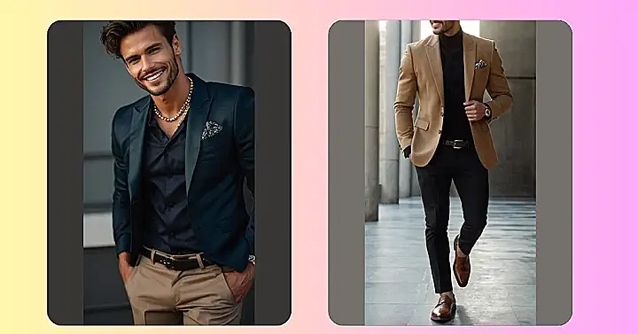 This camel-colored blazer is totally the answer to your “men Christmas party outfit” prayers! Forget the reindeer sweater – this sophisticated look is way more festive. Imagine strolling into the party, looking like you just stepped out of a holiday movie, but instead of battling snow, you’re dodging awkward uncles and questionable eggnog. The smart black trousers and brown loafers complete the outfit, ensuring you’re the best-dressed guy without trying too hard.