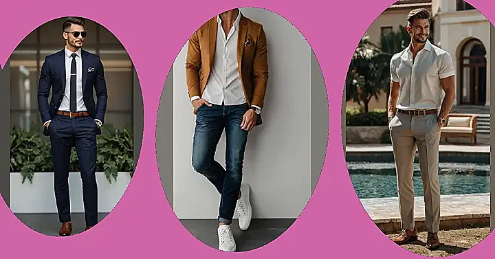 Look at this guy, looking all sharp near a pool like he’s about to have a super important business meeting about… well, maybe the best way to get a tan? Men’s business outfits aren’t always the super formal stuff you see in movies. Sometimes it’s just a cool short-sleeved shirt, nice pants, and snazzy shoes that say, “I’m professional, but I also know where the good snacks are.” It’s like business casual decided to take a vacation but still wanted to look good doing it.