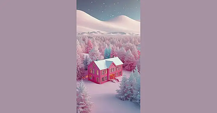This picture is like a dream come true for anyone who loves pink and winter! Just imagine waking up to this magical scene: a bright pink house nestled among snow-covered trees, all bathed in a soft pink light. It’s like stepping into a Christmas card, but even more fabulous! The whole thing is just bursting with cheer, and you can almost hear the faint jingle of sleigh bells in the air.