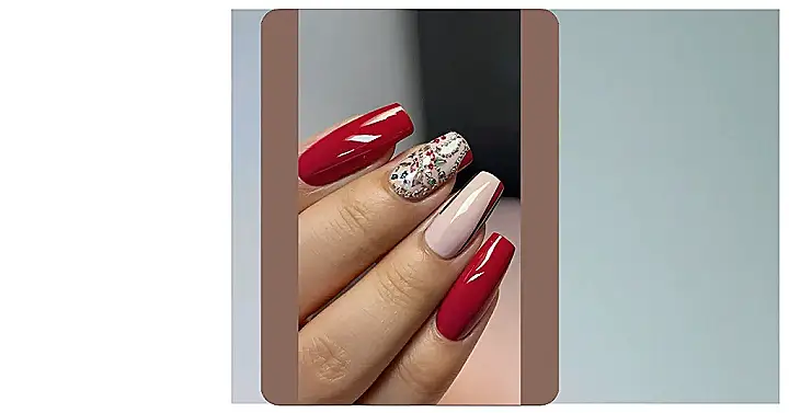 OMG, check out these nails! They’re like a tiny, glamorous party happening right on someone’s fingertips. The rich red is totally fire, but that sparkly, jeweled design? It’s next-level awesome. It’s like the nail artist sprinkled fairy dust and tiny treasures all over one nail—talk about making a statement! You could totally rock these to a dance, a holiday party, or even just to school to impress your friends. It’s the perfect mix of pretty and powerful.