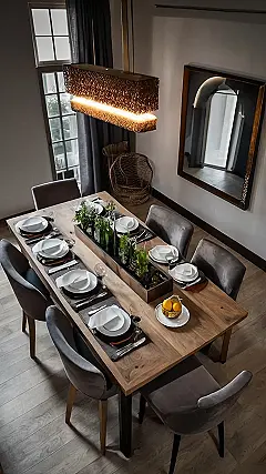 Imagine your dining room as a blank canvas, just waiting for its glow-up! This picture shows how you can totally transform your space into something special. Notice the little details, like the plants and that cool light fixture, that take it to the next level. You can get creative and add your own personal touch too!