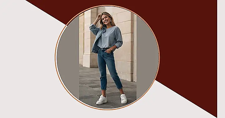 Seriously, who needs a complicated outfit when you can rock this easy and amazing look? The mom jeans are the star of the show, bringing a retro-cool feel, but the light blue top and jacket make the whole thing feel super fresh and modern. The white sneakers add that finishing touch of casual perfection, like the cherry on top of a delicious ice cream sundae. It’s a look that screams “I’m comfortable and confident,” which is way more important than any complicated fashion statement.