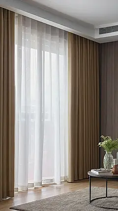 The image shows a window with beautiful curtains. The curtains are actually two layers, one sheer and white, and one thicker and a lovely brown color. This is a clever trick to make the room look stylish, but also let in lots of light. Imagine yourself waking up in the morning to the soft, warm glow of sunlight filtering through the curtains. It would make you feel like a queen or a king!