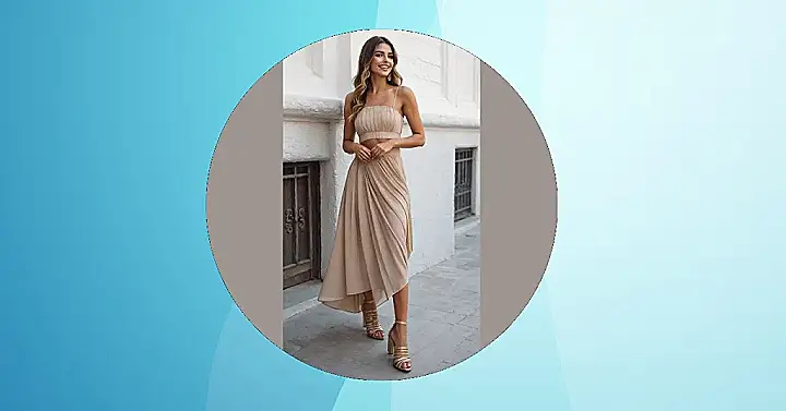 Getting ready for a fiesta isn’t just about finding any old outfit, it’s about finding *the* outfit that makes you feel ready to party. This gorgeous beige two-piece? It’s like the elegant friend who shows up looking super chill but is secretly the queen of the dance floor. The pleated top and flowy skirt look like they were made for twirling, which is pretty much requirement number one for any good fiesta. It might not be screaming bright colors, but it’s definitely shouting “I’m here to have a blast and maybe win a dance-off!”