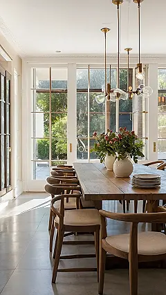 That rustic wooden table is totally giving me farmhouse chic vibes! Imagine all the family dinners and hilarious game nights you could have around it – maybe even a pie-eating contest? The big windows let in tons of light, perfect for showing off your awesome decor and making the room feel super cozy. Plus, those flowers are the cherry on top of a seriously stylish dining room. It’s like something out of a magazine, but way more comfortable and fun.
