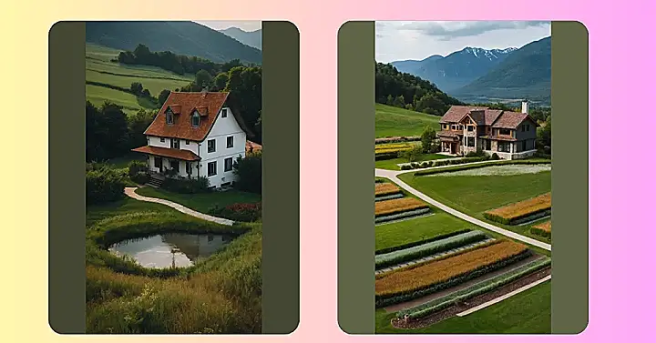 But the best part of this picture is the pond. It’s small, but it reflects the sky like a tiny mirror. The water is so still that it looks like it’s not even moving. You can almost imagine sitting on the porch of that house, watching the sun set over the hills and listening to the frogs croak in the pond. What a peaceful scene! It’s like something out of a book.