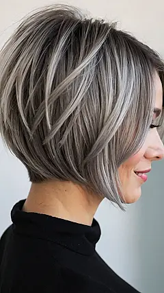 This picture shows a cool grey bob hairstyle. It’s like a perfect blend of chic and edgy – imagine a rockstar grandma, if that makes sense! The layers give it some extra volume, and the color looks super sleek and sophisticated. It’s like, “Hey, I’m cool, I’m stylish, and I’m totally rocking my grey hair.”
