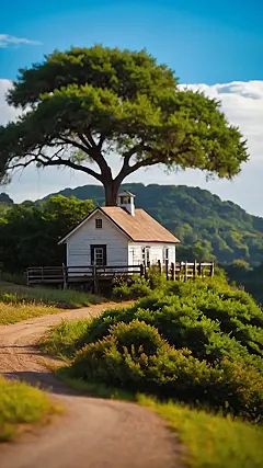 This picture shows a little white house nestled among the green hills, a perfect scene for a peaceful summer day. It looks like something straight out of a fairytale, with a big tree casting a shadow over the whole place. The house is surrounded by a little fence and a winding dirt road that looks like it leads to a secret spot in the woods. It’s like something out of a movie, and I bet there are tons of amazing adventures to be had around that house.