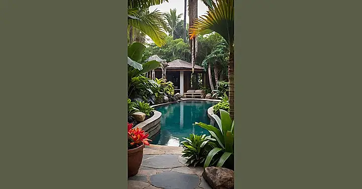 It’s super cool how people can design their backyards to look like this. You can have your own private little jungle, with waterfalls and everything! I bet it’s super fun to splash around in that pond and pretend you’re exploring a hidden jungle. This picture shows how beautiful and peaceful a tropical landscape can be, making it a fun place to play or simply relax and enjoy nature.