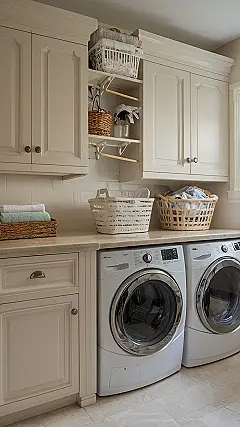 Imagine this: you’re tackling that mountain of laundry, but instead of feeling stressed, you’re feeling… relaxed? Maybe it’s the calming cream-colored cabinets, maybe it’s the organized shelves, or maybe it’s the fact that your washer and dryer are so sleek they almost look like space-age appliances. Whatever it is, this laundry room has the power to transform even the most dreaded chore into a surprisingly enjoyable experience. Who knew laundry day could be so chic?