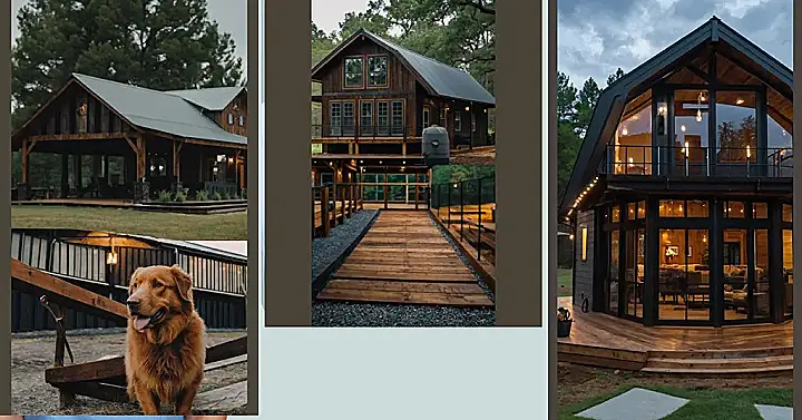 That dark, dreamy barndominium is the perfect hangout spot! Imagine cozy nights inside with all the windows glowing, making it feel super warm and inviting. The outside deck looks like the ideal place for summer barbeques and telling spooky stories around a campfire (maybe with some s’mores!). It’s compact, so cleaning is a breeze, but with all those windows, you’ve got amazing views of the forest surrounding it – super cool, right?