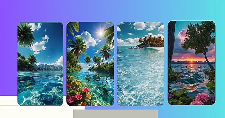 Looking at this water wallpaper is like someone shrunk a perfect tropical island and put it on your screen. Check out that crystal-clear water – you can practically see tiny fish waving hello from below the surface, and the sun sparkles like a million tiny diamonds! And those palm trees? They look ready to sway you right into a nap hammock. It’s almost unfair how good this looks; it makes you want to grab your swim trunks and cannonball right into your monitor, which, disclaimer: definitely don’t do that.